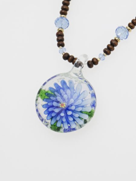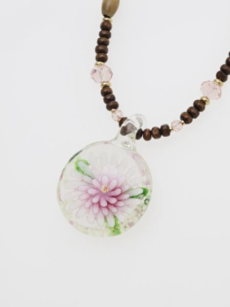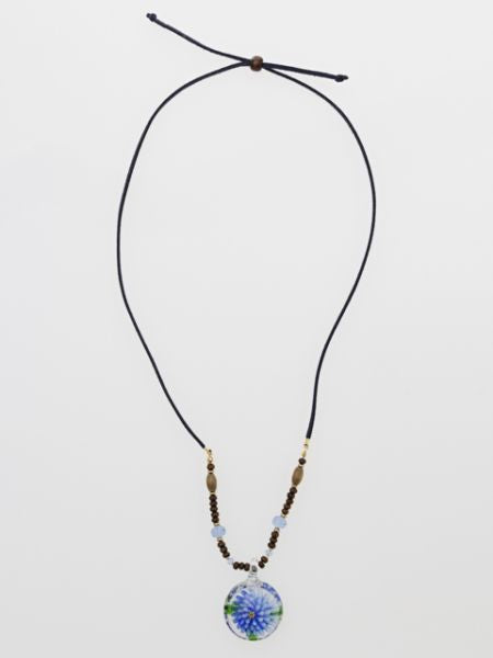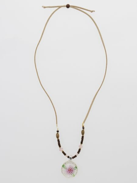 熟練した職人さんが一つ一つ丁寧に仕上げたガラス玉のペンダントヘッド。透明感のあるガラスの中に咲く、花モチーフが印象的。シンプルなネックレスコードにビーズを組み合わせた綺麗なカラーリングが特徴です。エスニックスタイルやカジュアルコーデのワンポイントに◎